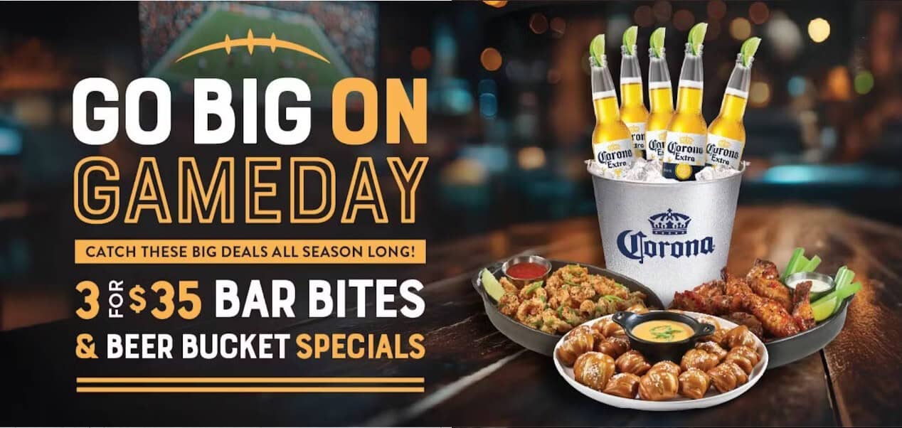 Game on! All season long, enjoy 3 Bar Bites for just $35 and score big with beer bucket specials at select locations. Rally your crew, grab your favorites, and catch every play at Bar Louie this season!